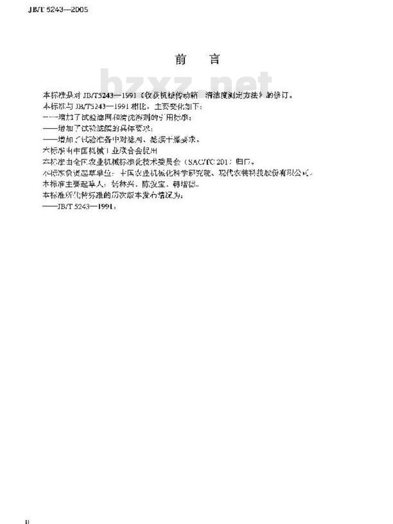 本标性是对JB/T5243一1991收张机械转动箱游洁度测定方法的修订标与Y3TS243—1991树E,主恶变化刻下:一…-增打了战验滤网和清选降剂的用标境一增加了试骏法糜的具体要戏:增加,计验准各中对滤网、滤模十煤要求。六标作中压机械!业获合会杞出主标准出全E农业析械标游化技术姿员会(S点C[C201:厂。标源谈起草单位:十压农业机械化科学可究院、现代农装科技股份有限公心,木标准主要起草人:标林兴,陈宝、韩增德本标准所标准的历次版本发力炼况为:JB/TS243—199L: