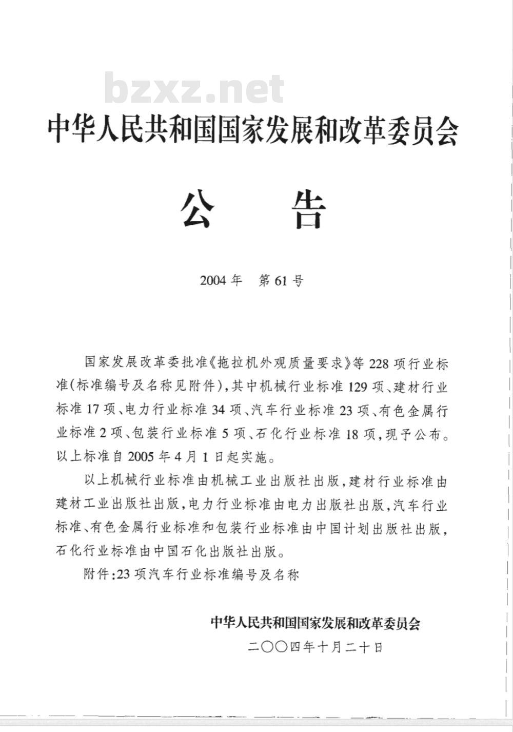 国家发展改革委批准《拖拉机外观质量要求》等228项行业标准(标准编号及名称见附件),其中机械行业标准129项、建材行业标准17项、电力行业标准34项、汽车行业标准23项、有色金属行业标准2项、包装行业标准5项、石化行业标准18项,现予公布。以上标准自2005年4月1日起实施。以上机械行业标准由机械工业出版社出版,建材行业标准由建材工业出版社出版,电力行业标准由电力出版社出版,汽车行业标准、有色金属行业标准和包装行业标准由中国计划出版社出版,石化行业标准由中国石化出版社出版。附件:23项汽车行业标准编号及名称中华人民共和国国家发展和改革委员会二〇〇四年十月二十日