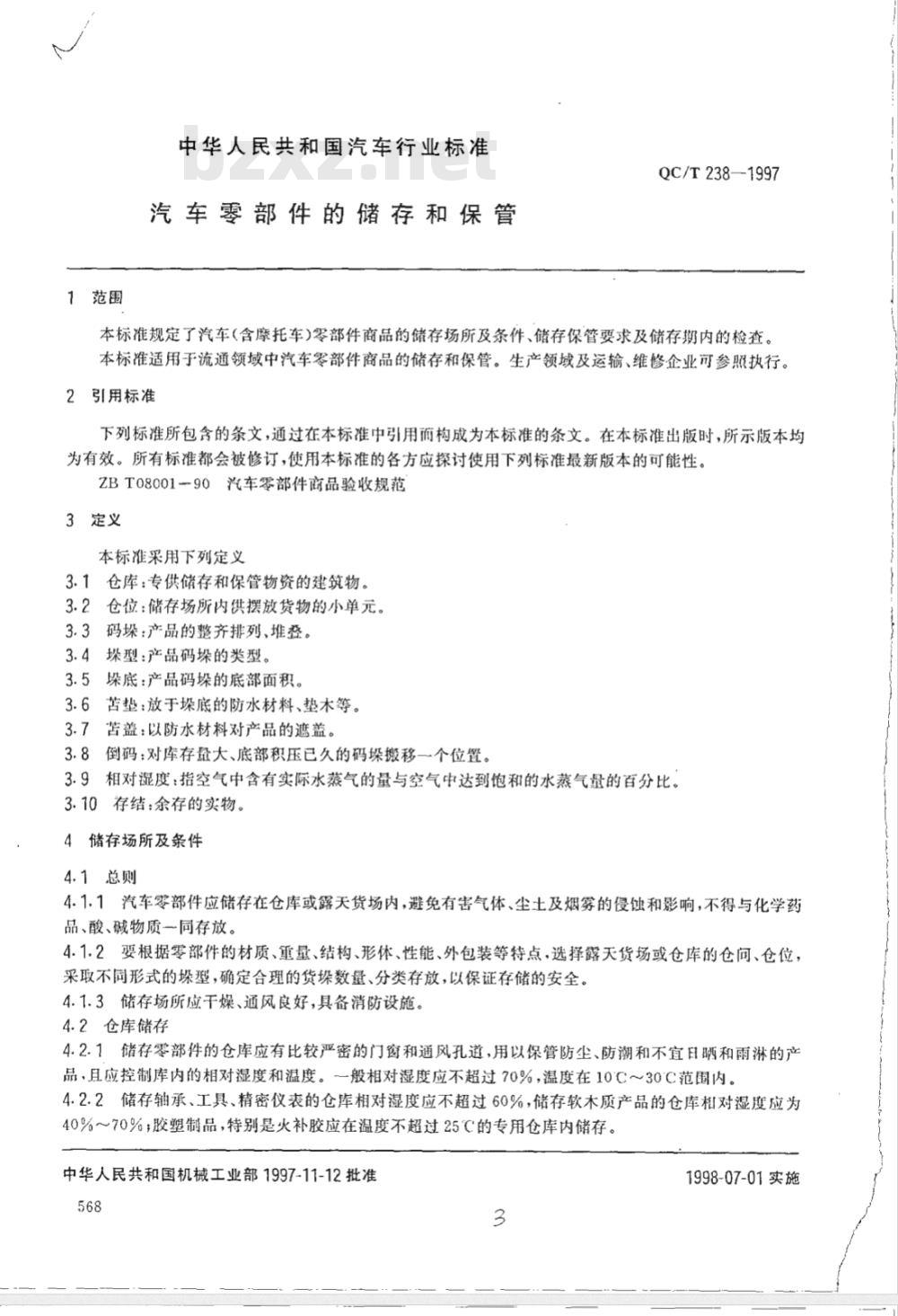 本标准规定了汽车(含摩托车)零部件商品的储存场所及条件、储存保管要求及储存期内的检查。本标准适用于流通领域中汽车零部件商品的储存和保管。生产领域及运输、维修企业可参照执行。2引用标准