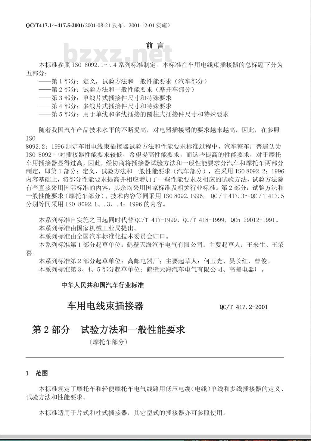 - QC/T 417.2-2001 车用电线束插接器 第2部分 试验方法和一般性能要求(摩托车部分)