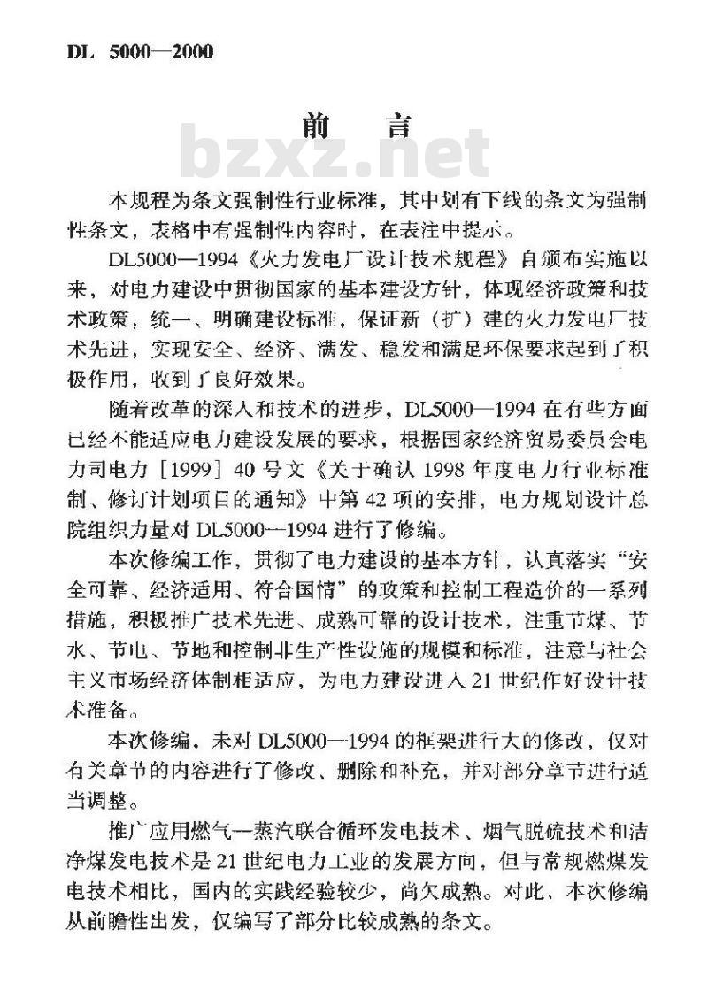 本规程为条文强制性行业标准,其中划有下线的条为强制性条文,表格中有强制性内容时,在表注中提示。DL5000一1994火力发电厂设技术规程》自频布实施以来,对电力建设中贯彻国家的基本建设方针,体现经济政策和技术政策,统一、明确建设标继,保证新(扩)建的火力发电授术先进,实现安全、经济、满发、稳发和满足环保要求起到了积极作用,收到了食好效果。