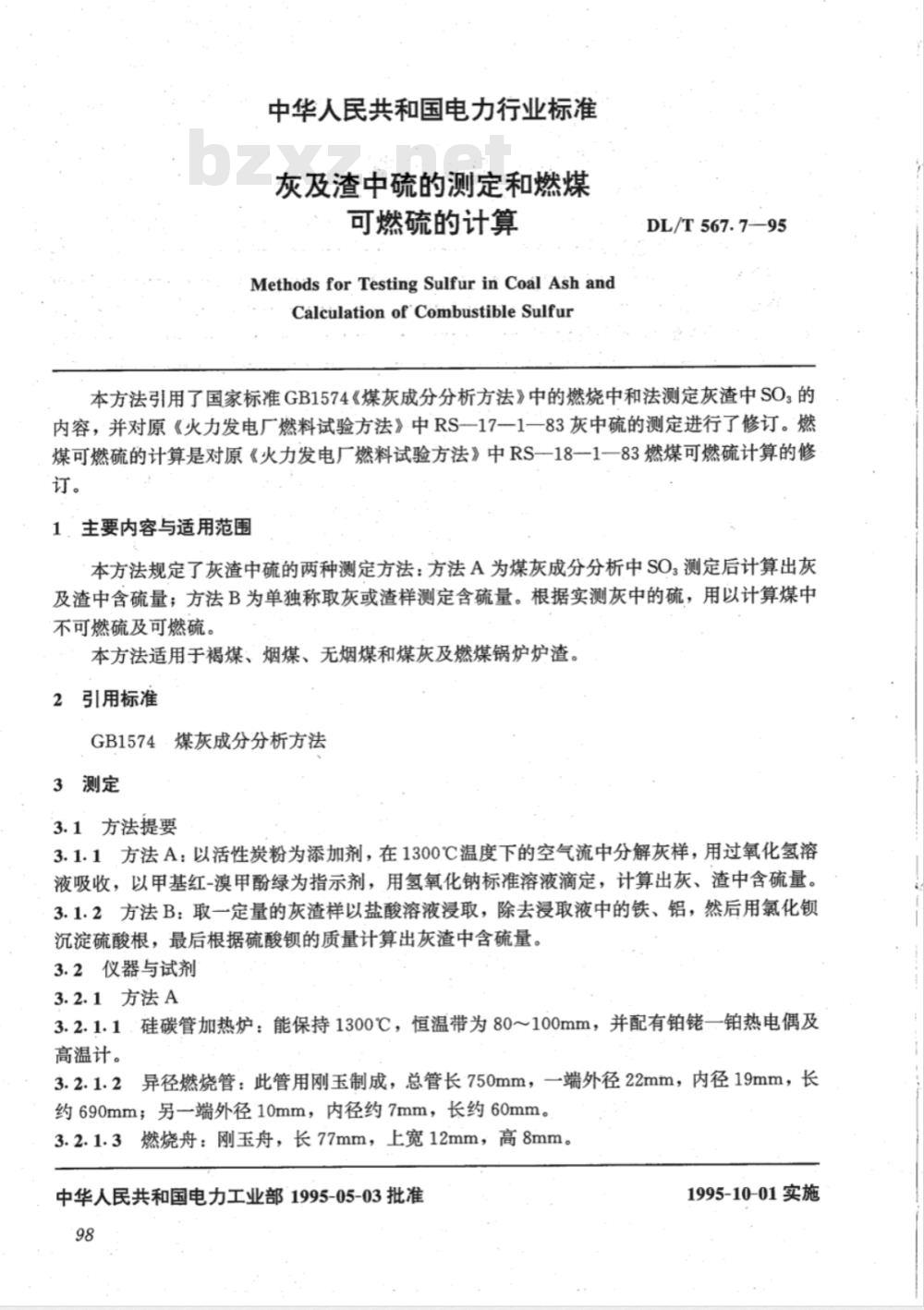 3.2.1.2异径燃烧管:此管用刚玉制成,总管长750mm,一端外径22mm,内径19mm,长约690mm;另一端外径10mm,内径约7mm,长约60mm。3.2.1.3燃烧舟:刚玉舟,长77mm,上宽12mm,高8mm。中华人民共和国电力工业部1995-05-03批准98