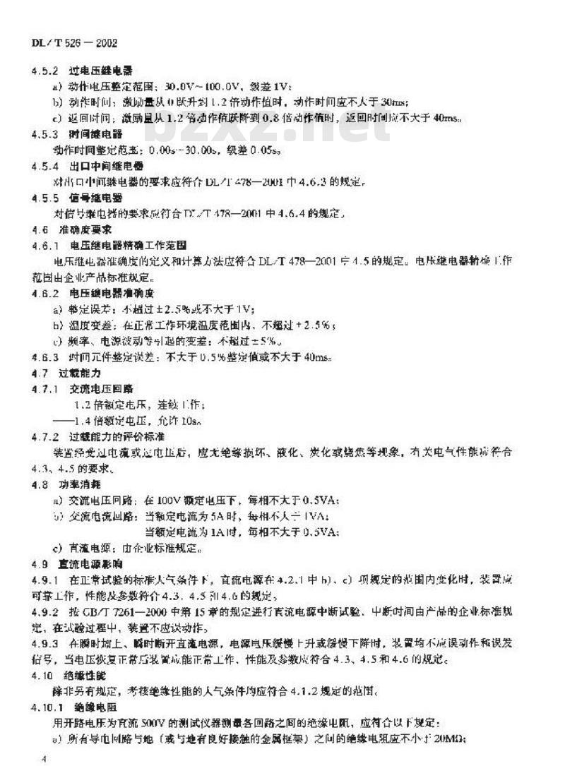 a)是误并:小超过±2.5%或不大于1V;b)温度变差:在正常工炸环境温度范围内,不超过+2.5%5)频率、电源被动等与起的变差:不超过±5%。4.6.3时而元件整定误差:不天于0.5%整定值或不大于40ms.4.7过裁能力
