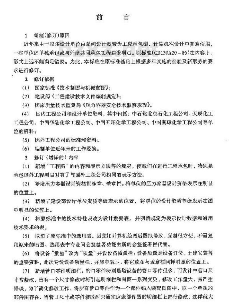 近年来出于很多设计单位出单纯设计型转为工程承包型:计算机在设计中普通使用,一些单微还单独率过或与外商共同承包工程建设项日。原标准(CD130A20-86)在内容.上,形式上遍不能竭足器要。为此,标准在原标准基码上根据多年实施的经验及新形势的要求进行修订。
