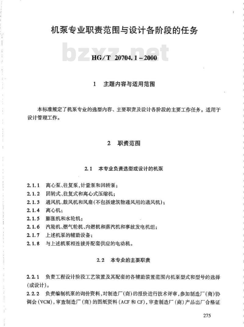 - HG/T 20704.1-2000 机泵专业职责范围与设计各阶段的任务