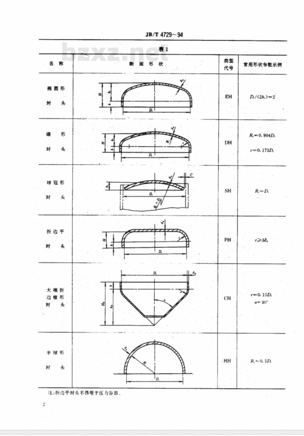 采用表1示例中形状参数的封头,可不标记曲面深度或锥壳半顶角、直边高度。型号标记示例