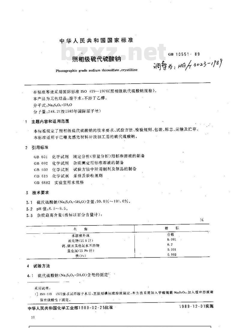 本标准规定了照相级硫代硫酸钠的技术要求、试验方法、检验规则、包装,标志,运输及贮存。本标准适用于已曝光感光材料冲洗加工瓜的硫代硫酸钠,2引用标准