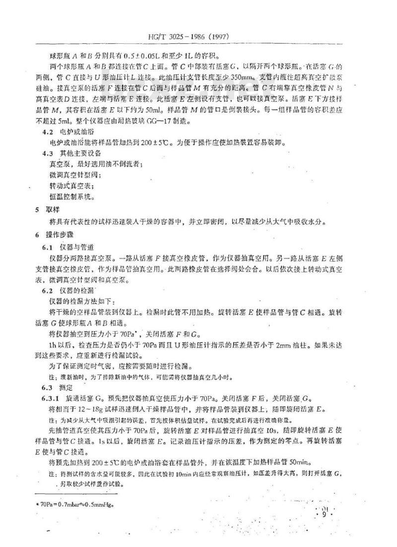 将仪器抽空到压力小于70Pa,关闭活塞F和G。1h以后,检查压力是否仍小于70Pa而且U形油压计指示的压差是否小于2mm油柱。如果末达到这些要求,应重新进行检漏试验。为了保证测定时气密,应按需要随时进行检漏。注:漩新油时,为了排除新油中的气体,可能需将仪器抽真空几小时。6.3测定