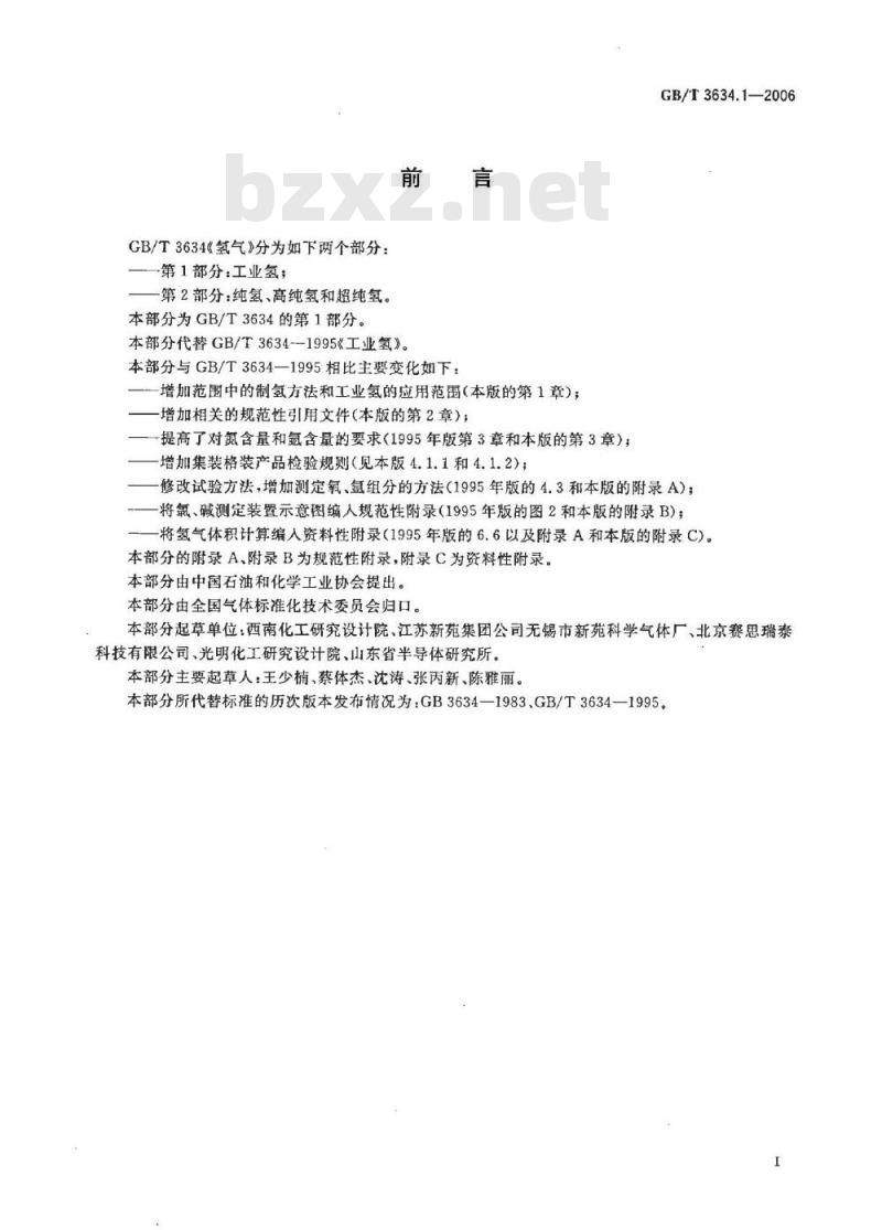 修改试验方法,增加测定氧、氩组分的方法(1995年版的4.3和本版的附录A);将氯、碱测定装置示意图编人规范性附录(1995年版的图2和本版的附录B);将氢气体积计算编入资料性附录(1995年版的6.6以及附录A和本版的附录C)。本部分的附录A、附录B为规范性附录,附录C为资料性附录。本部分由中国石油和化学工业协会提出。本部分由全国气体标准化技术委员会归口。本部分起草单位:西南化工研究设计院、江苏新苑集团公司无锡市新苑科学气体厂、北京赛思瑞泰科技有限公司、光明化工研究设计院、山东省半导体研究所。本部分主要起草人:王少楠、蔡体杰、沈涛、张丙新、陈雅丽。本部分所代替标准的历次版本发布情况为:GB3634—1983.GB/T3634—1995。工