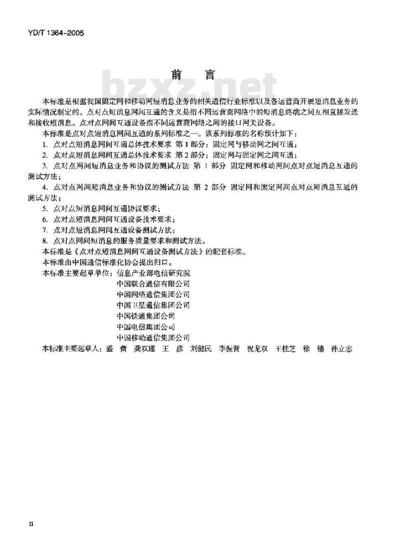 5.点对点短消息网间互通协议要求;6.点对点短消息网闻互通设备技术要求;7、点对点短消息网闻互通设备测试方法;8,点对点网间短消息的服务质量要求和测试方法。本标准是点对点短消息网间方通设备测试行法的配套标准。本标准由中国通信标准化协会提出归口。本标准主要起草单位:信息产业部电信研究院中国联合通信有限公司