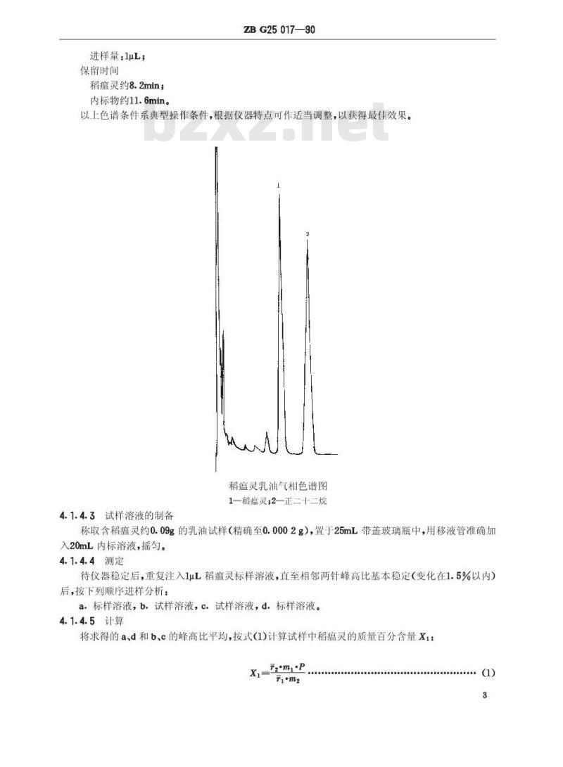 式中:1一一标样溶液中稻瘟灵与内标物峰高比的平均值;T2——试样溶液中稻瘟灵与内标物峰高比的平均值;m1——稻瘟灵标准样品的称样量,gm2——稻瘟灵试样的称样量,g;P—一稻灵标准样品的百分含量,%。4.1.5允许差