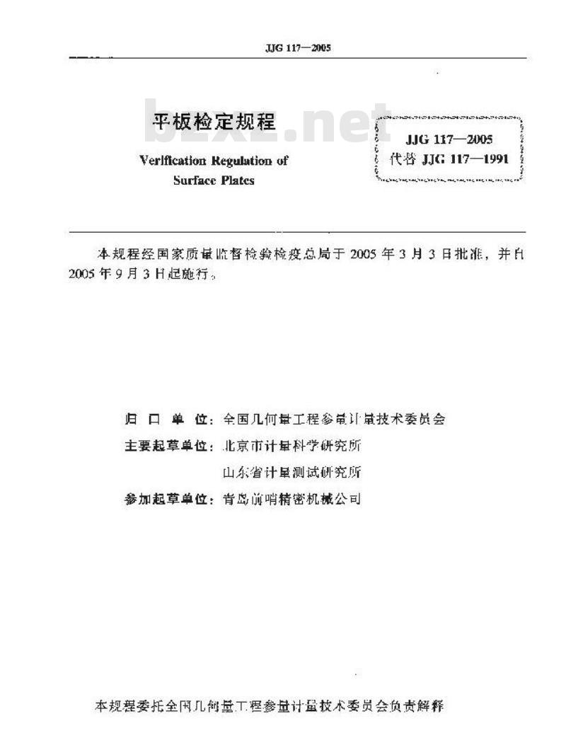本规程适用于铸铁平板和岩石平板的首次检定、后续检定和使用中检验。 JJG 117-2005 平板检定规程 JJG117-2005