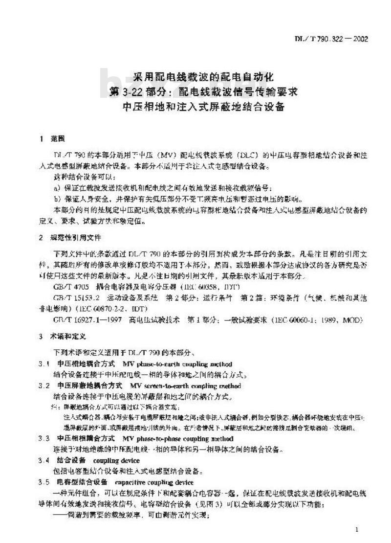 DL/T 790的本部分适用于中压(MV)配电线载波系统(DLC)的中压绝缘电容型相相结合设备和注人式电感型屏蔽地结合设备。本部分不适用于非注人式电感型结合设备。a) 保证在载波发送接收机和配电线之间有效地发送接收信号;b) 保证人身安全,并保护有关低压部分不受工频高电压和暂态过电压的影响。本部分规定了用于中压配电线载波系统的中压绝缘电容型相相结合设备的定义、要求、试验方法和额定值。 DL/T 790.322-2002 采用配电线载波的配电自动化 第3?22部分:配电线载波信号传输要求 中压相地和注入式屏蔽地结合设备 DL/T790.322-2002