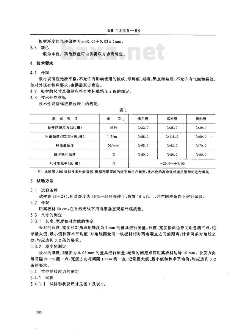 注:冰箱用ABS板材技术性能指标,根据所用原料的级别和用户需要,按相应的高冲级或通用级指标进行考核。5试验方法