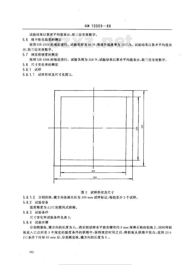 分别测量纵、横方向的长度为L。,然后把试样水平放在铺有约3mm厚滑石粉的铝板上,同时将铝板放入已达到表3中规定的温度条件的烘箱中,保持规定时间之后,将铝板从烘箱中取出,放到23土2'C条件下冷却60min后,分别测定纵、横方向的长度为L。262