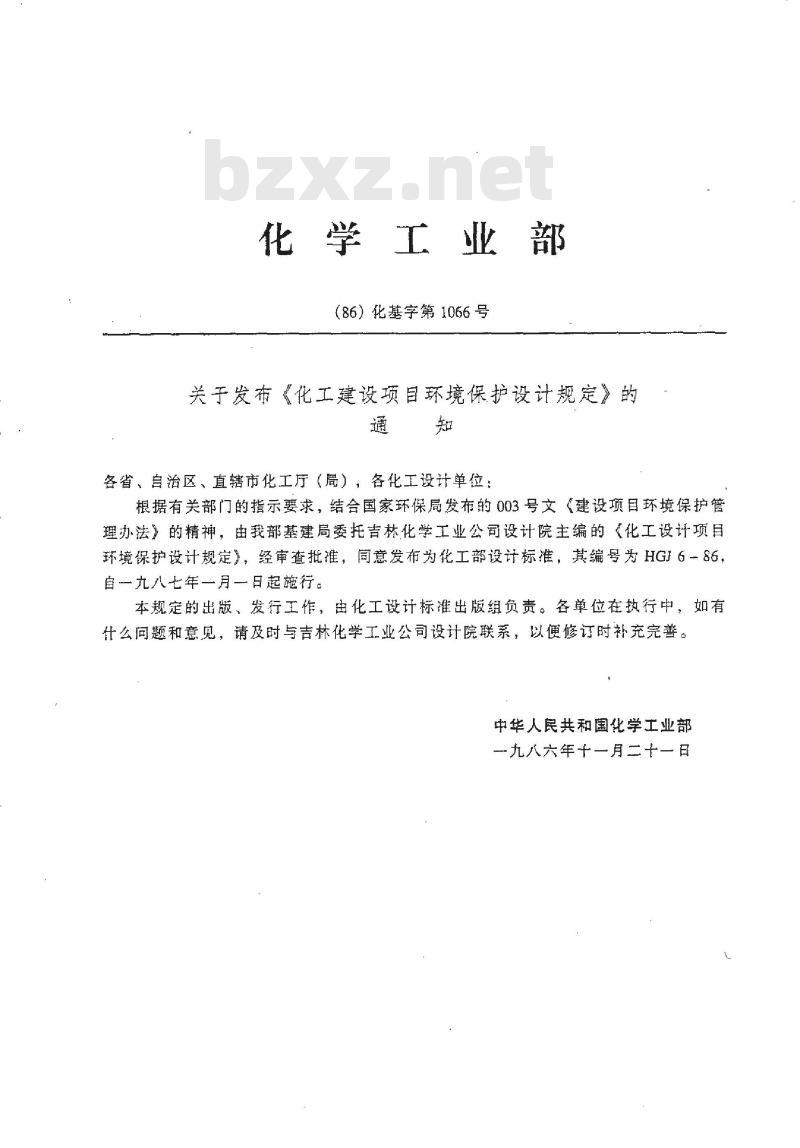 各省、自治区、直辖市化工厅(局),各化工设计单位:根据有关部门的指示要求,结合国家环保局发布的003号文《建设项目环境保护管理办法》的精神,由我部基建局委托吉林化学工业公司设计院主编的《化工设计项目环境保护设计规定》,经审查批准,同意发布为化工部设计标准,其编号为HGJ6-86,自一九八七年一月一日起施行。本规定的出版、发行工作,由化工设计标准出版组负责。各单位在执行中,如有什么问题和意见,请及时与吉林化学工业公司设计院联系,以便修订时补充完善。中华人民共和国化学工业部