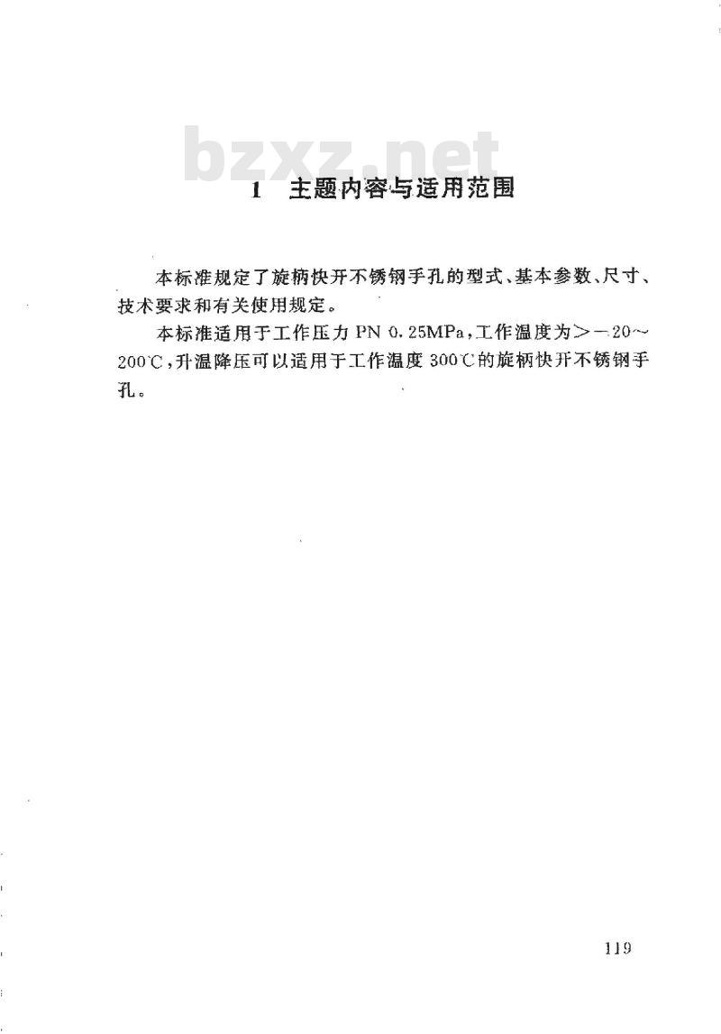 本标准规定了旋柄快开不锈钢手孔的型式、基本参数,尺寸、技术要求和有关使用规定。Www.bzxZ.net