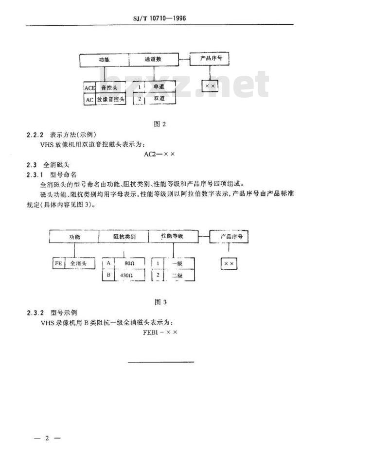 视频磁头的型号命名由种类、制式、功能和产品序号四项组成。SJ/T10710-1996