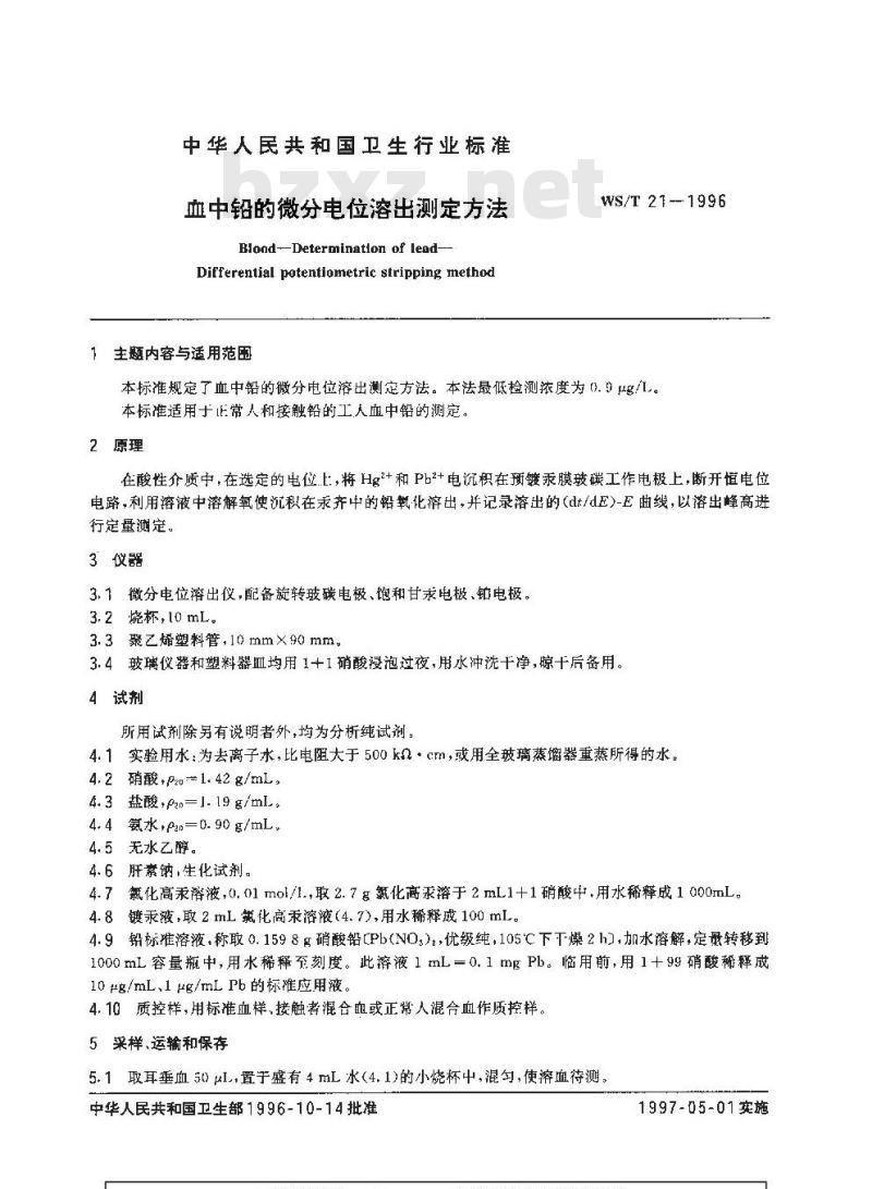 - WS/T 21-1996 血中铅的微分电位溶出测定方法