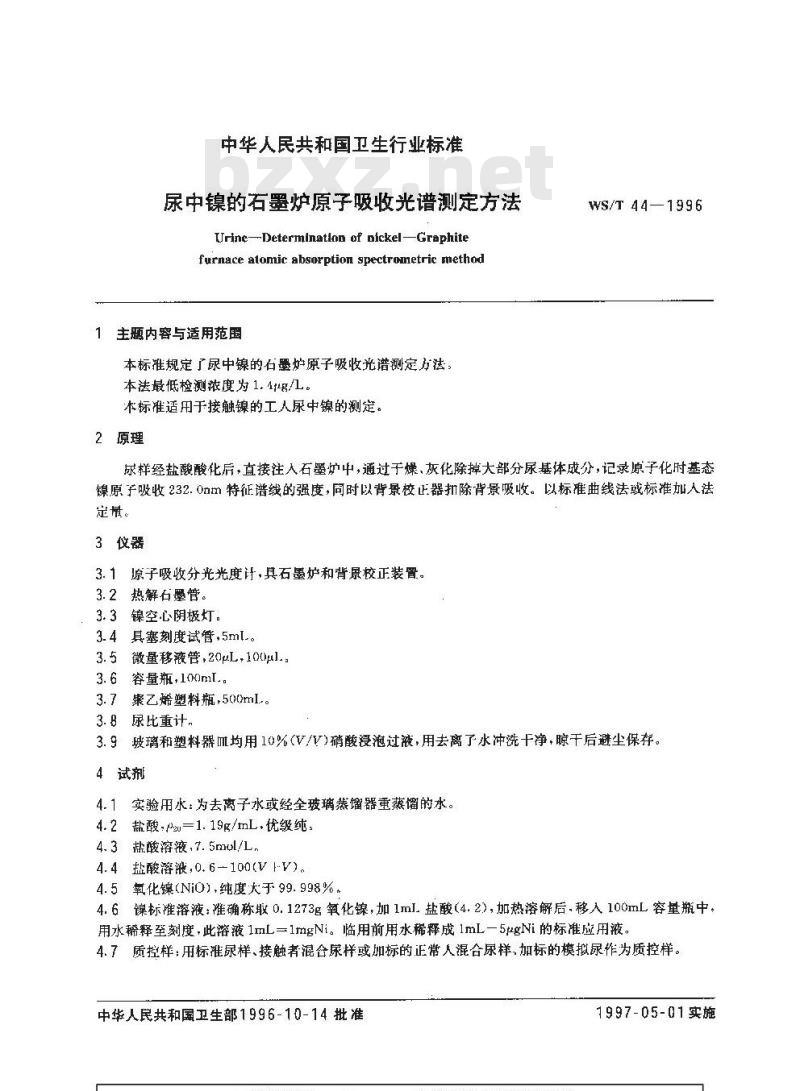 - WS/T 44-1996 尿中镍的石墨炉原子吸收光谱测定方法