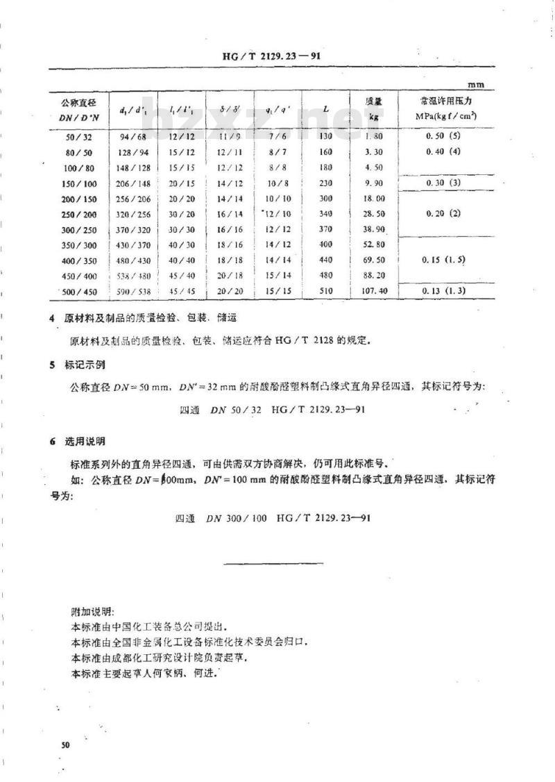 标准系列外的直角异径四通,可由供需双方协商解决,仍可用此标准号,如:公称直径DN=00mm,DN=100mm的耐酸酚醛塑料制凸缘式直角异径四通,其标记符号为:
