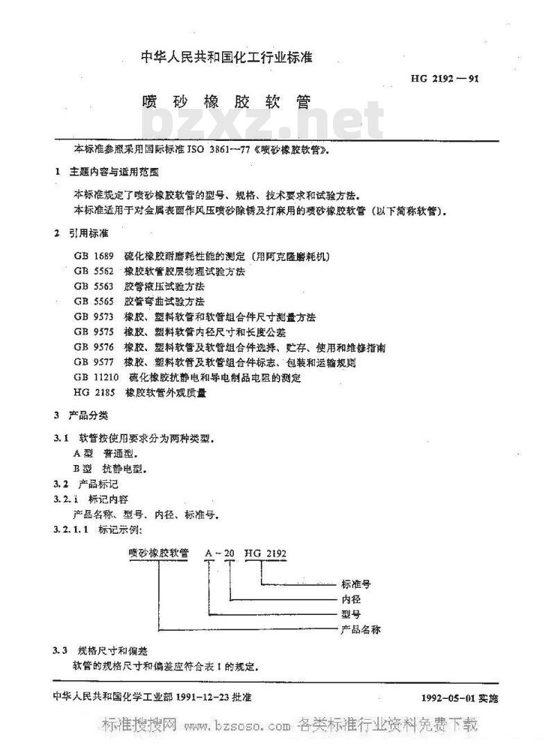 本标准规定了喷砂橡胶软管的型号、规格、技术要求和试验方法:HG 2192 —91