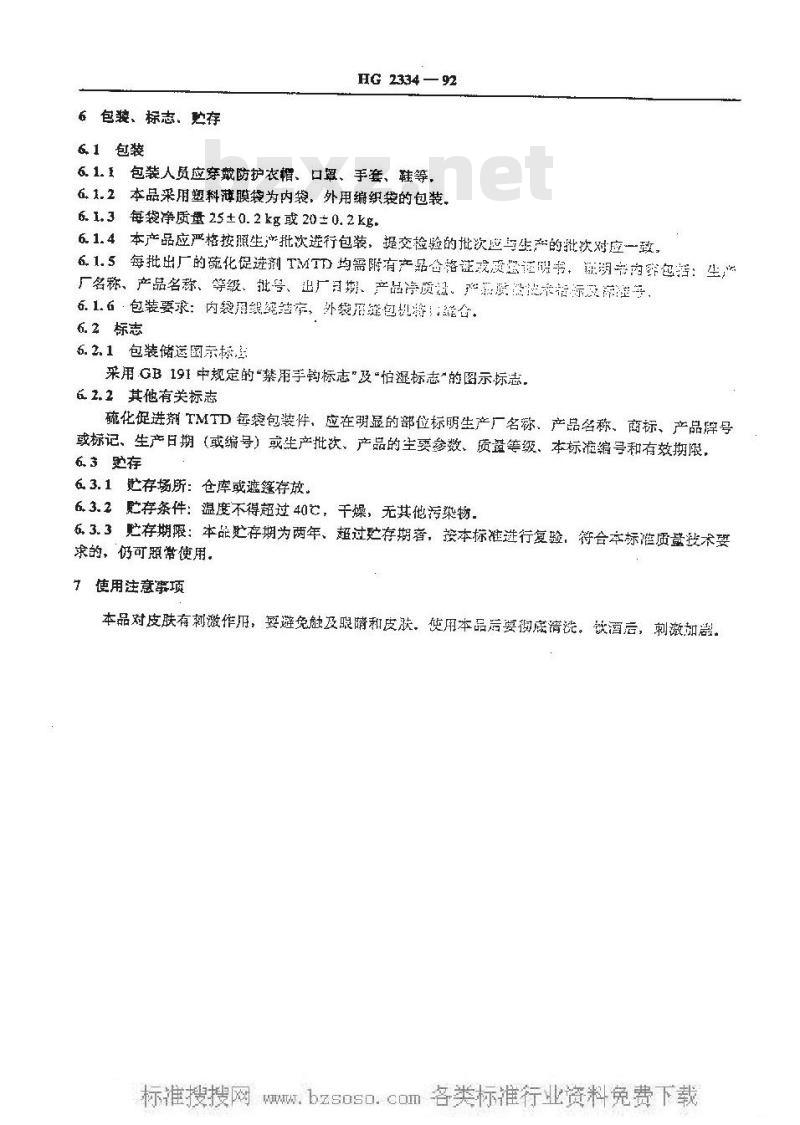 硫化促进剂TMTD每袋包装件、应在明显的部位标明生产厂名称、产品名称、商标、产品牌号或标记、生产日期(或编号)或生产批次、产品的生要参数、质盘等级、本标范编号和有效期限,6.3存