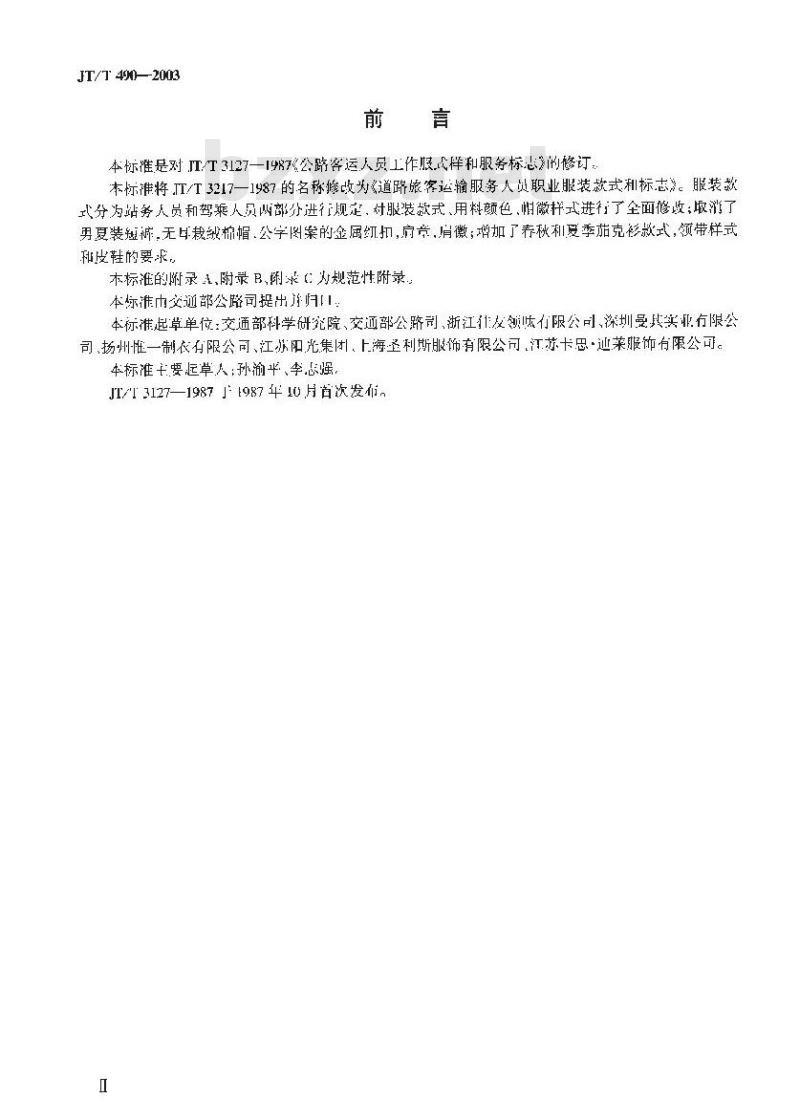 - JT/T 490-2003 道路旅客运输服务人员职业服装款式和标志