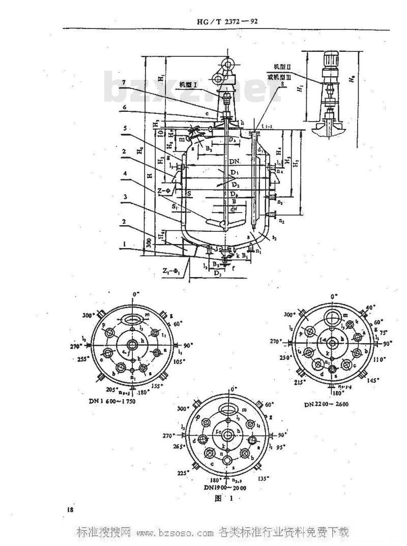 :3.1型式、基本参数及尺寸见图1、图2、表1至表4,3.2闭式搅摔容器按HG2036标准规定,相同公称容积分L系列和S系列两种公称直径(L系列和S系列分别为瘦长型和矮胖型的结构型式)。按使用条件选用,注1):糖玻璃闭式搅拌容器在原化工部标准中称之为据玻璃F型反应罐中华人民共和国化学工业部1992-09-15批准1993-07-01实施