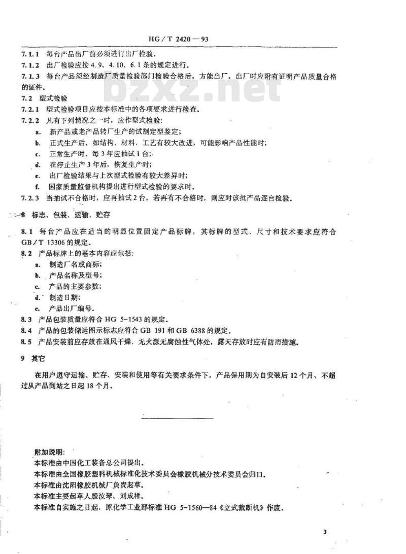 本标准由中国化工装备总公司提出本标准由全国橡胶塑料机械标准化技术委员会橡胶机械分技术委员会归口.本标准由沈阳橡胶机械厂负责起草。本标准主要起草人殷汝琴、刘成祥本标准自实施之日起,原化学工业部标准HG5-1560—84《立式裁断机》作废,中华人民共和