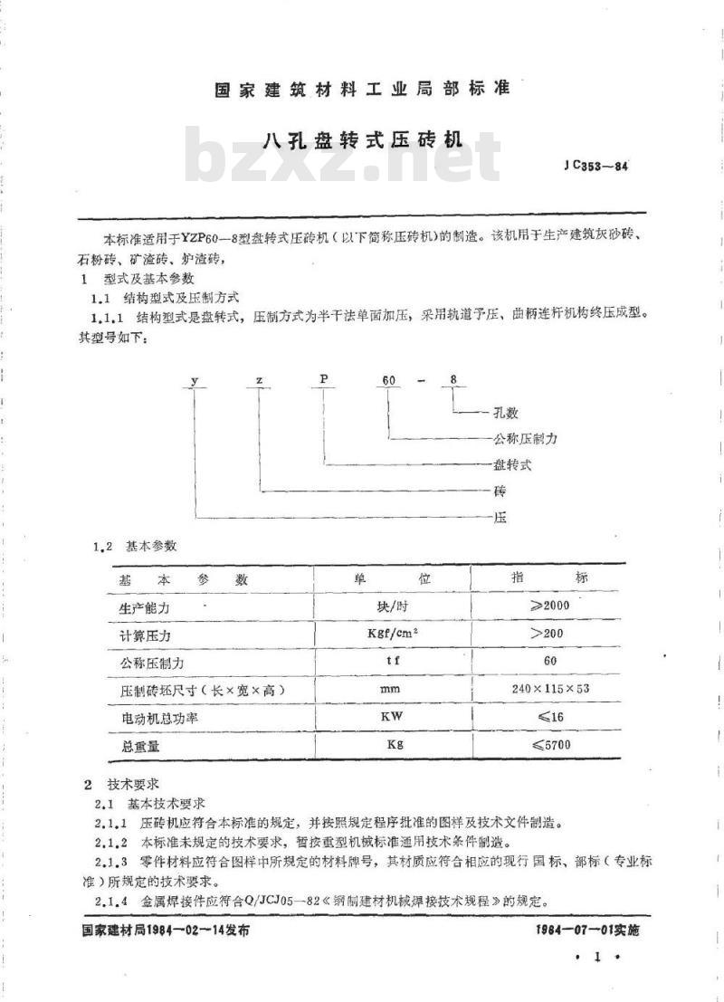 本标准适用于YZP60一8型盘转式压砖机(以下简称压砖机)的制造。该机用于生产建筑灰砂砖、石粉砖、矿渣砖、炉渣砖,
