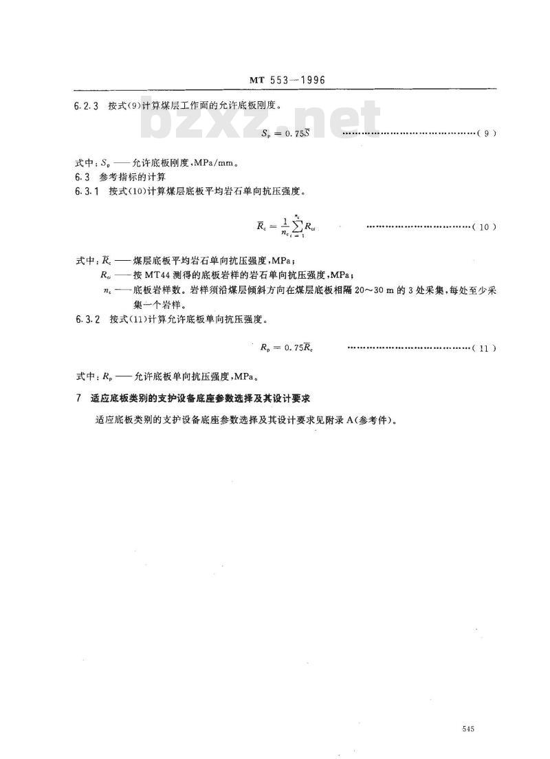 式中:R,—允许底板单向抗压强度,MPa。7适应底板类别的支护设备底座参数选择及其设计要求适应底板类别的支护设备底座参数选择及其设计要求见附录A(参考件)。(11)