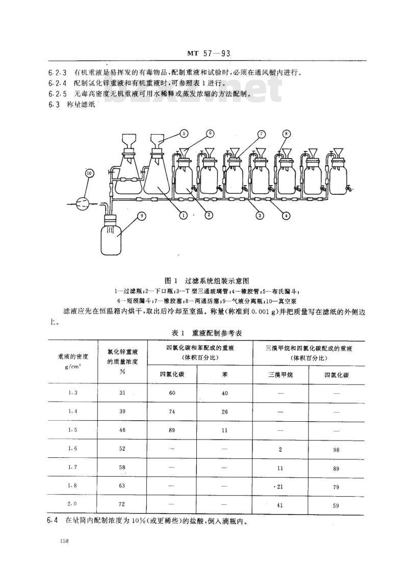 6.2.3有机重液是易挥发的有毒物品,配制重液和试验时,必须在通风橱内进行。6.2.4配制氟化锌重液和有机重液时,可参照表1进行。6.2.5无毒高密度无机重液可用水稀释或蒸发浓缩的方法配制。6.3称量滤纸