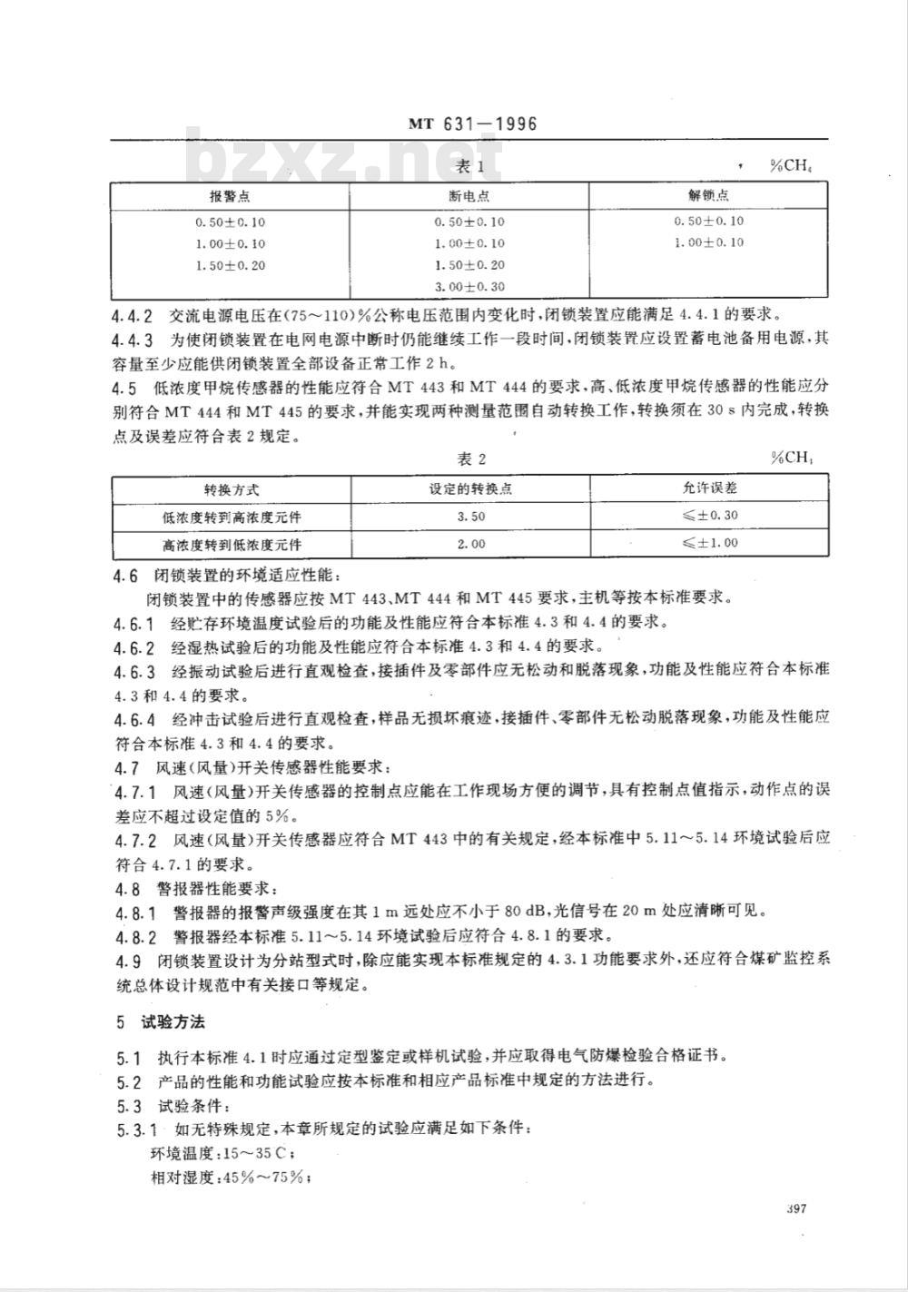 4.4.2交流电源电压在(75~110)%公称电压范围内变化时,闭锁装置应能满足4.4.1的要求,4.4.3为使闭锁装置在电网电源中断时仍能继续工作一段时间,闭锁装置应设置蓄电池备用电源,其容量至少应能供闭锁装置全部设备正常工作2h。4.5低浓度甲烷传感器的性能应符合MT443和MT444的要求,高、低浓度甲烷传感器的性能应分别符合MT444和MT445的要求,并能实现两种测量范围自动转换工作,转换须在30$内完成,转换点及误差应符合表2规定。