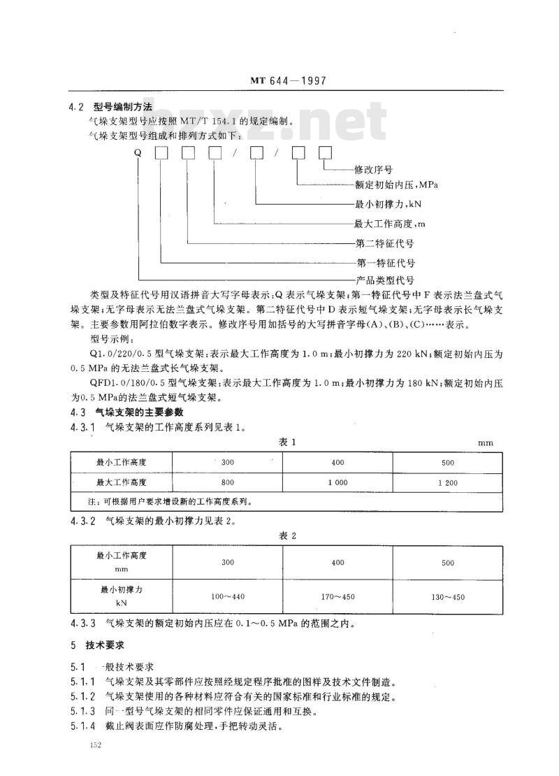 4.1.1气垛支架按其结构可分为法兰盘式和无法兰盘式。4.1.2气垛支架按其长度可分为长气垛支架和短气垛支架。长度为1400mm以上的(含1400mm)为长气垛支架,以下的为短气垛支架。中华人民共和国煤炭工业部1997-11-10批准1998-04-01实施