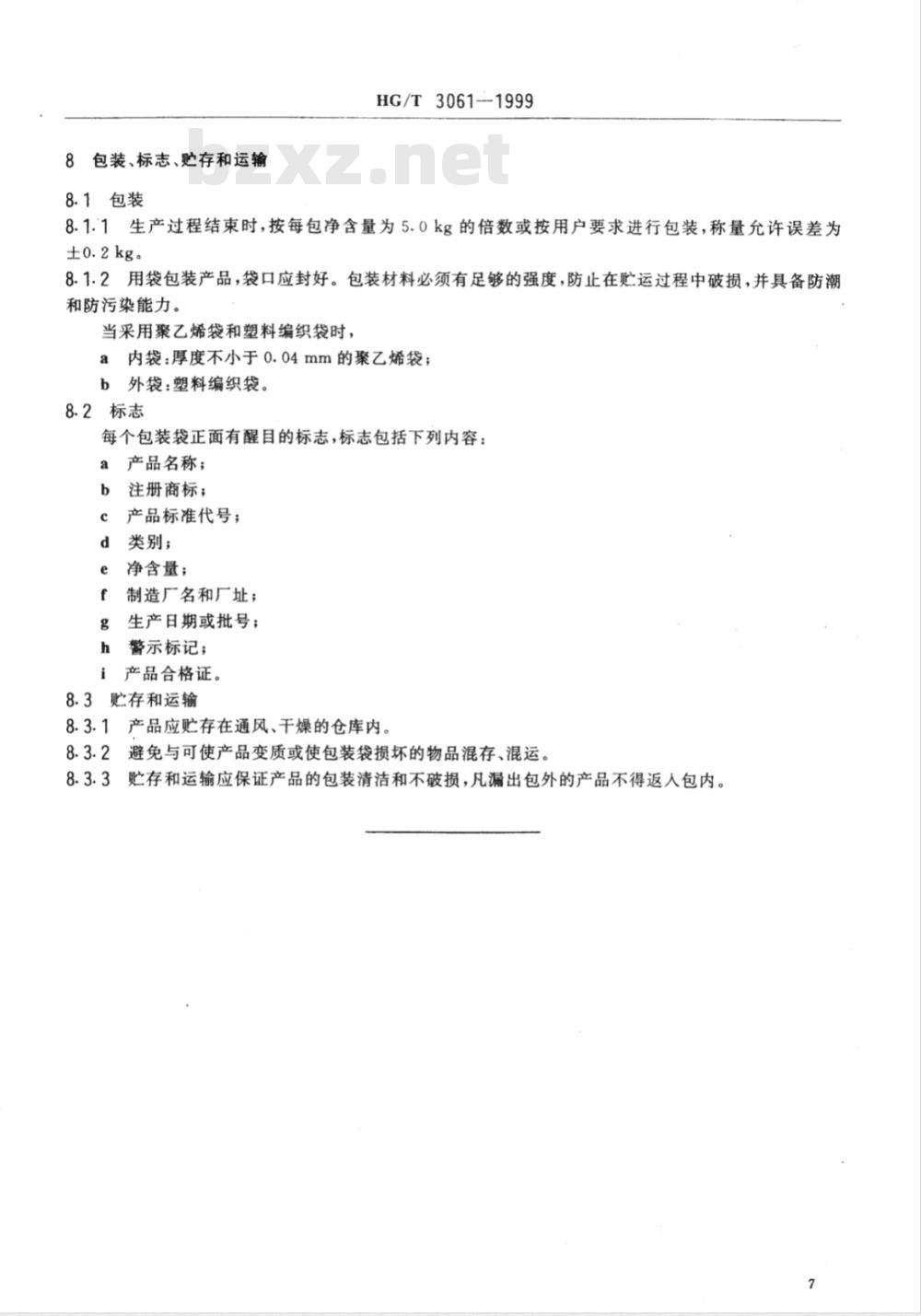 8.1.1生产过程结束时,按每包净含量为5.0kg的倍数或按用户要求进行包装,称量允许误差为±0.2kg。
