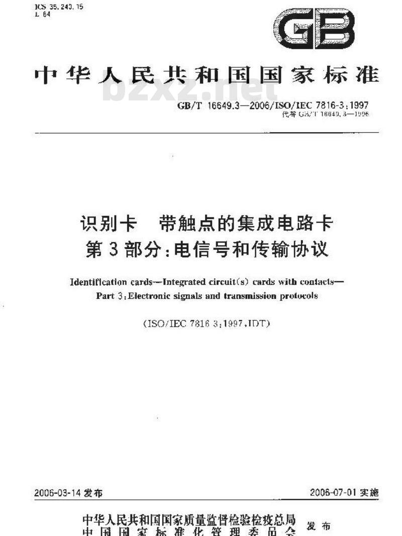- GB/T 16649.3-2006 识别卡 带触点的集成电路卡 第3部分:电信号和传输协议