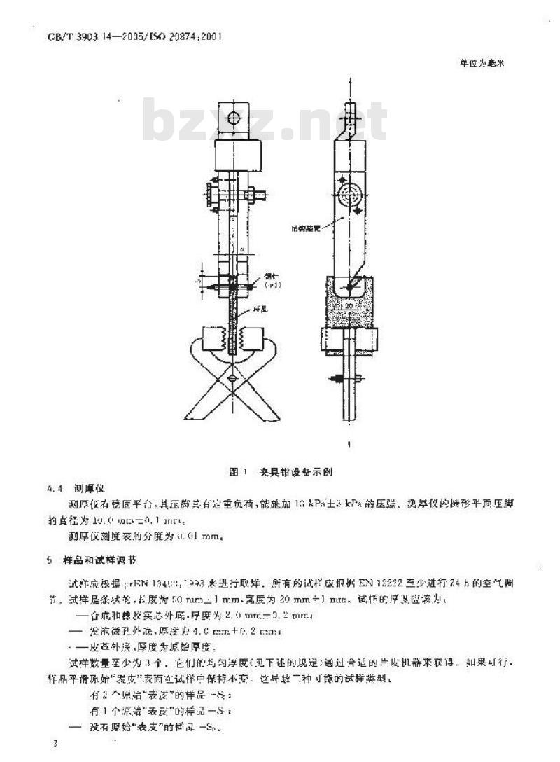 CB/T3903.14—2005/[S020874.2001使用早收(见1划定试的厚度。距离试详缘5m的邮用针先.2刺穿试样(见图1),辅助值用模故使之尽可能的垂,后前试样不应被钻孔或冲孔,格带针试样敢世在光钳中(见4.)。调节吊均装置之间的距离独其与试排初接触为试底部克抗士下文其针中(见图1中的剪刃式夹只钳),过光具钳速度100mm/m:士1Gmm/:l将试样拉紧。读取成样被计撕破的最大方值,单位为N,