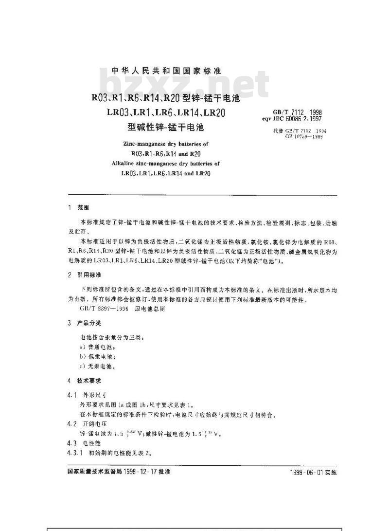 GB/T 7112-1998 R03、R1、R6、R14、R20型锌-锰干电池 LR03、LR1、LR6、LR14、LR20型碱性锌-锰干电池 GB/T7112-1998