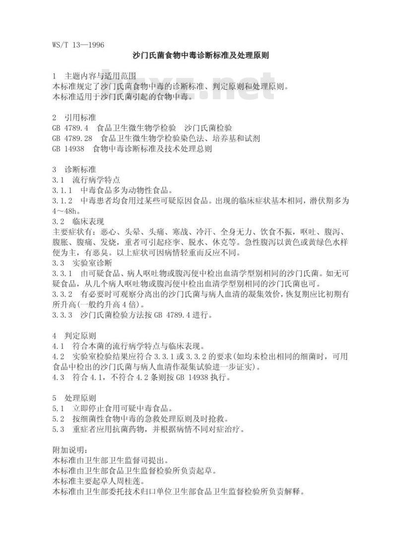 - WS/T 13-1996 沙门氏菌食物中毒诊断标准及处理原则