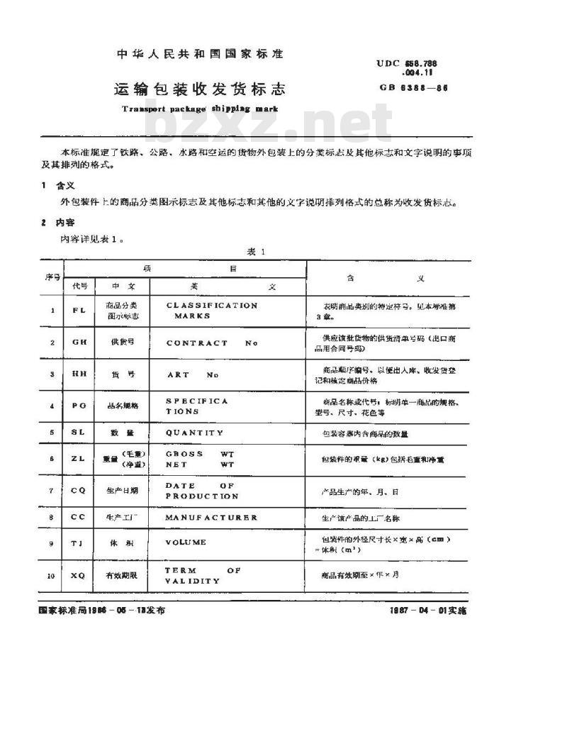 本标准规定了铁路、公路、水路和空运的货物外包装上的分类标志及其他标志和文字说明的事项及其排列的格式。 GB 6388-1986 运输包装收发货标志 GB6388-1986