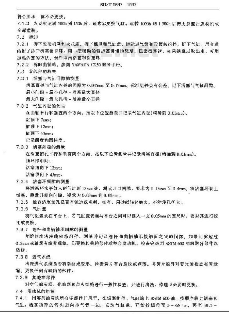 7.1.3发动机法转t0到150h后,通常而更换气缸。运转1000h到1500h尼需更换整台发动机或全部法装。