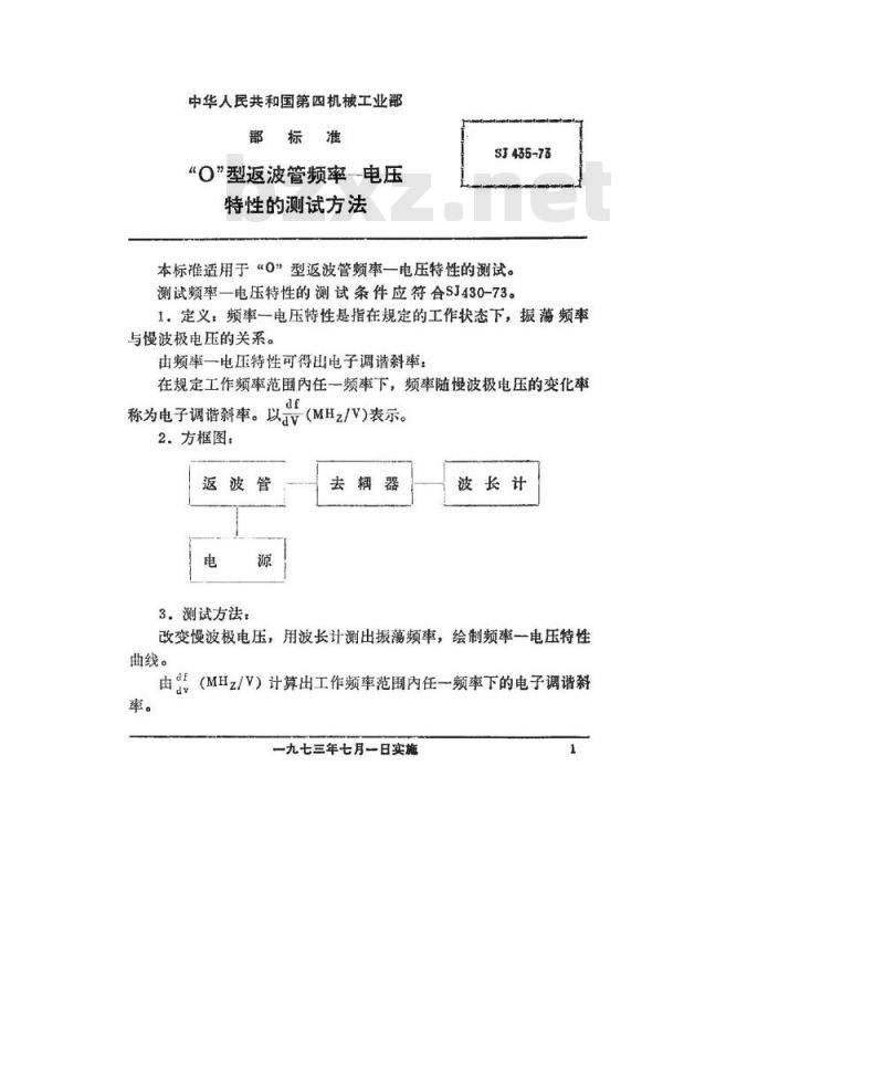 本标准适用于O型返波管频率-电压特性的测试。测试频率-电压特性的测试条件应符合SJ430-73. SJ 435-1973 O型返波管频率-电压特性的测试方法 SJ435-1973