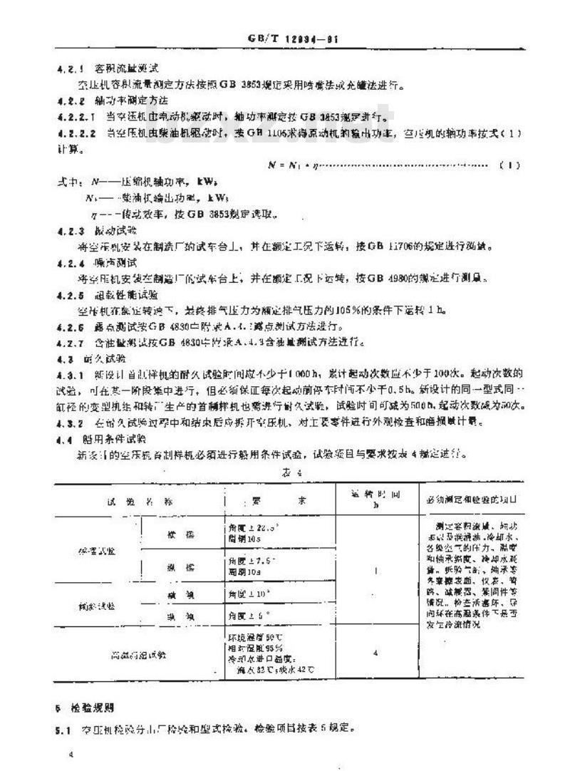 高.3.1新设计首择机的耐久试验时间应不少于10h,累计起动次数不少于100次。起动次数的试验,可年基一阶段举中进行但必须保证每次起纳前径车时问不小于0,5h。新设计的同一型式同缸径的变型执组和转生产的首样机也需进行时久试验,试险时间可减为510,起动次致减为动次。4,3.2在的久试给过孕中和结央后应拆开压机、对工要零件进行外观检查和语做计量。44赔用条件试验