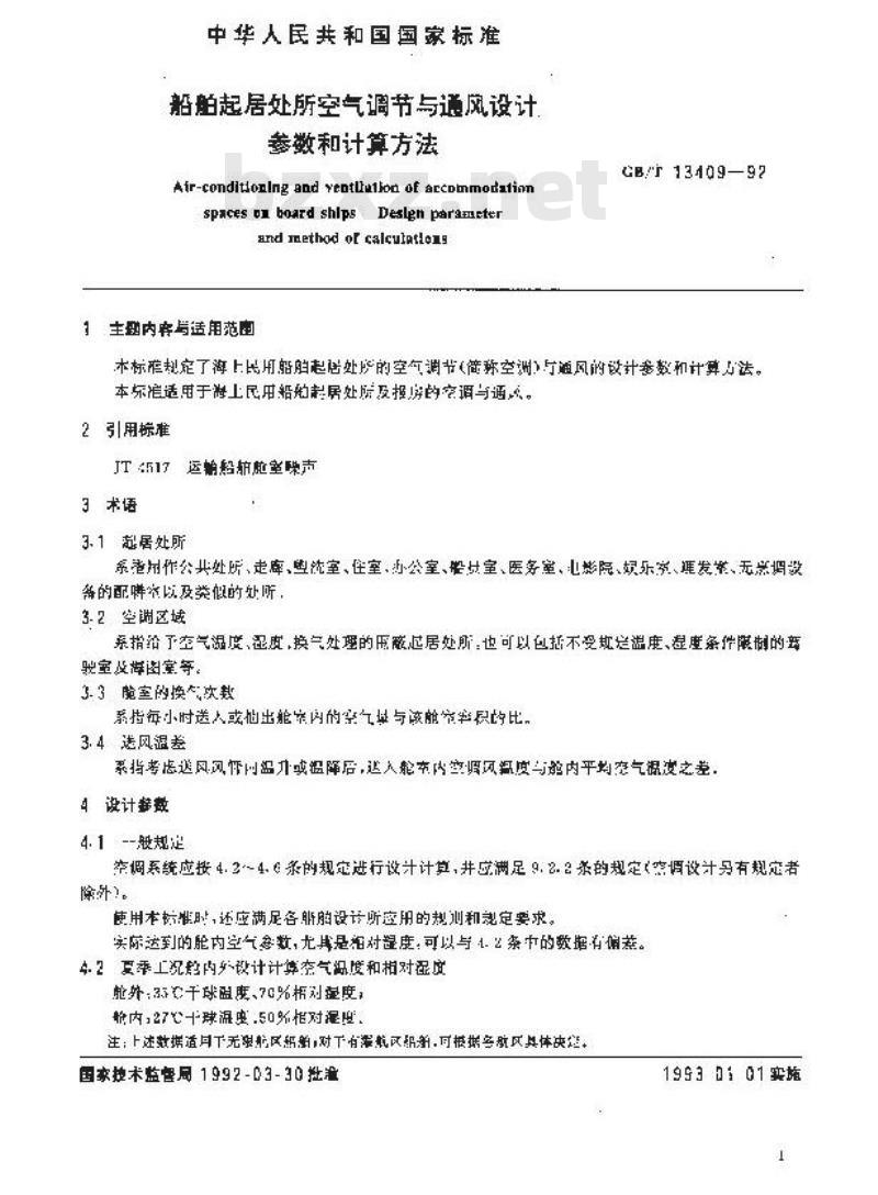 - GB/T 13409-1992 船舶起居处所空气调节与通风设计参数和计算方法