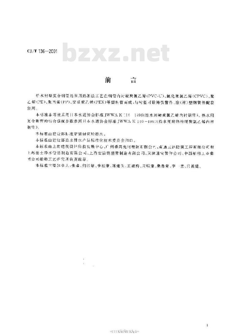 “给水衬塑复个钢管行业标准系根据建设部建标[:999]159号“关于印发建设部一儿儿儿年算批【业产品行业标准制、修订项目计划》的通知”由.海建筑设计科技发展中心主编,参编单位有广州各阳先河塑钢有限公可、南通三达防腐工程有限公司和上海德上净术管道制造有限公司、」海宏洁钧朔管制造有限公、天律产通宝管件公司,中国船舶工业集团公司舶舶工艺研究所等单位:编制组在总结国内制造商的企业标准基础上吸改国外间类产品制造商的技术资料,编制了征求意见稿,按各地的文函总州进行分机整弹义提中了修收稿,并于2300年?月5月召开编制组扩人会议重点征求设计,施工、质脂等部门烹见,井收集了日本水道协会标在JWWAK1.6一1996给水用硬我氯7.烯内衬钢管和JWW14G给水用耐热性硬聚氯乙烯内衬钢管》,为综制我国给水衬塑复台钢管》行业标准莫定了基谢,于2501年3月提出了送审箱。于2001年1月川过宜查本行业推参考了E本术道协会的上述两个标准、详就下列问题阐述如下:1标准名移