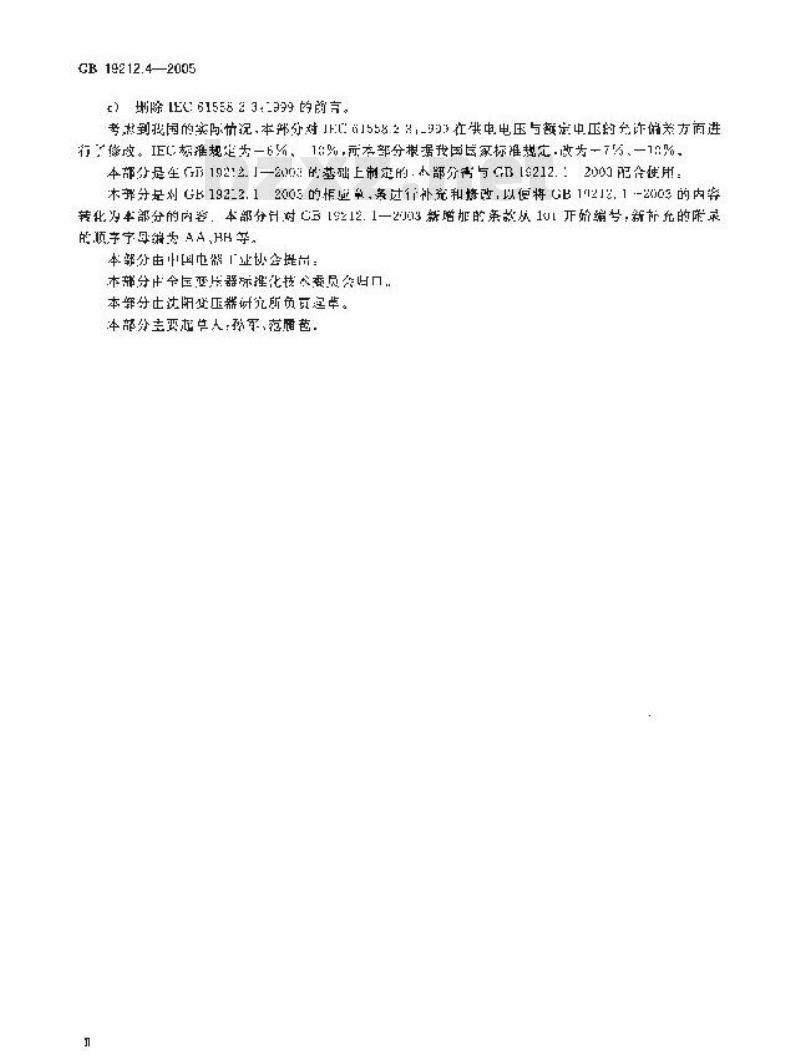 GB 1921 2.1?2003的该章用下列内容来代替:本部分规定了变压器各个方面(例如:_电气、温度和机械方面)的安全要求。本部分适用于同定式、单相、空气冷却(自然冷却或强制冷却)、配套用(内装式或非内装式)燃气和燃油燃烧器点火系统用的变压器,其额定电源电压不超过交流1 000 V、额定频率不超过500 Hz,额定输出电流不超过交流500 mA。空载输出电压和额定输出电压不应超过交流15 000 V。本部分适用于按安装规程或设备规范,不要求电路之间采用双重绝缘或加强绝缘的变压器。本部分适用于十式变压器。其绕组可以是密封或非密封的。本部分适用于包含有电子电路的变压器。本部分小适用于拟接到变压器输入端子和输出端子或插座的外部电路及其器件。 GB 19212.4-2005 电力变压器、电源装置和类似产品的安全 第4部分:燃气和燃油燃烧器点火变压器的特殊要求 GB19212.4-2005
