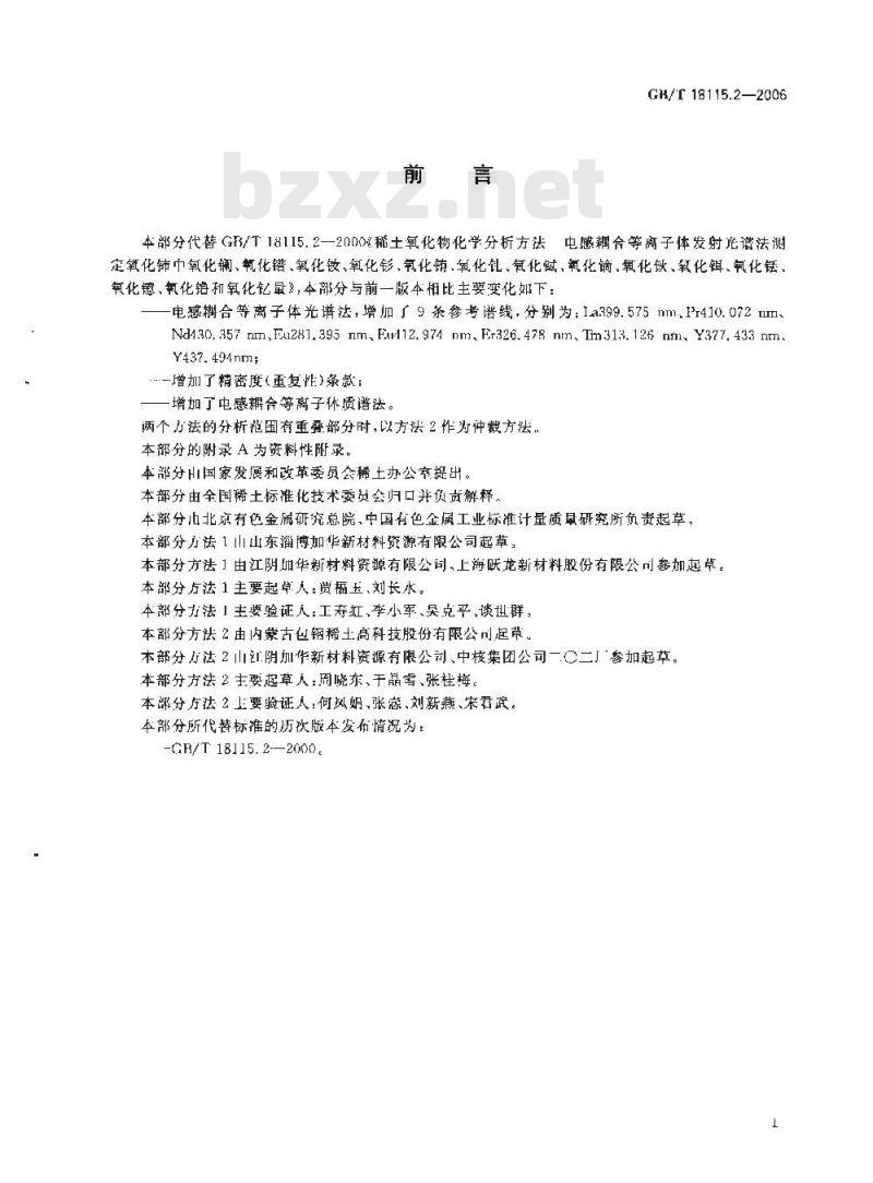 本部分山国家发展和改革委员会稀七办公室拐出,本部分由全国稀土标准化技术委员会归口开负贡解释,本部分马北京有色金属碰究总院,中国有色金属工业标准计基质星研究所负责起草,本部分方法1山山东淄博加华新材料资源有限公司起草:本部分方法由江阴加华新材料资源有限公司、上海跃龙新材料股份有限公司参加起草。本部分方法1主要起卓人:贾福玉,刘长水。本部分方法」主要验证人:工寿扛,李小军、吴克平,谈逊群本部分方法2由内蒙古包钢稀土高科技股份有限公司起草。本部分法2山江阴加华新材料资源有限公司、中核集团公司一二厂参加起草。本部分方法2主要起草人:周晓东、于晶雪、张桂梅本部分方法2上要验证人何风娟,张、刘新燕、宋君武。本部分所代替标准的历次版本发布情况为:-GR/T 18115.2--2000