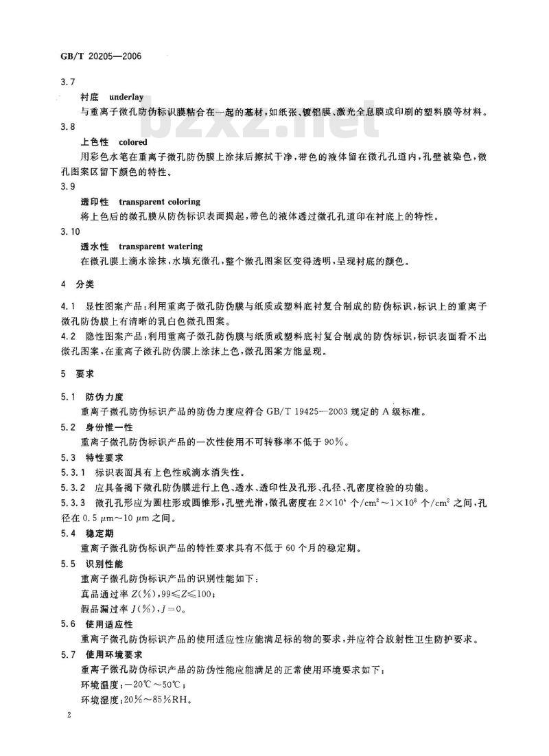 重离子微孔防伪标识产品的一次性使用不可转移率不低于90%。5.3特性要求www.bzxz.net