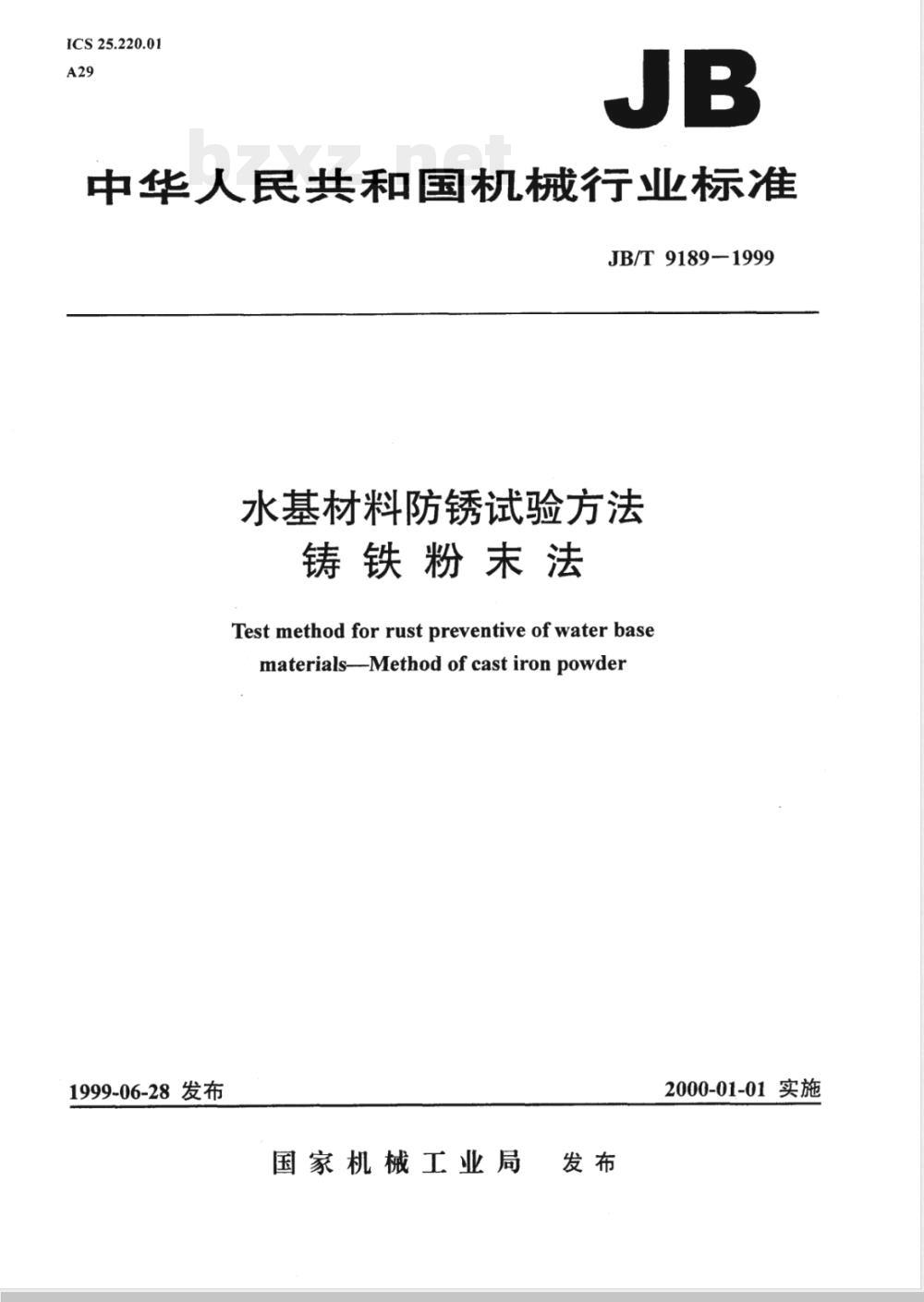 Test method for rust preventive of water basematerials-Method of cast iron powder本标准规定了用铸铁粉末测定水基材料防锈性能的试验方法。JB/T9189—1999